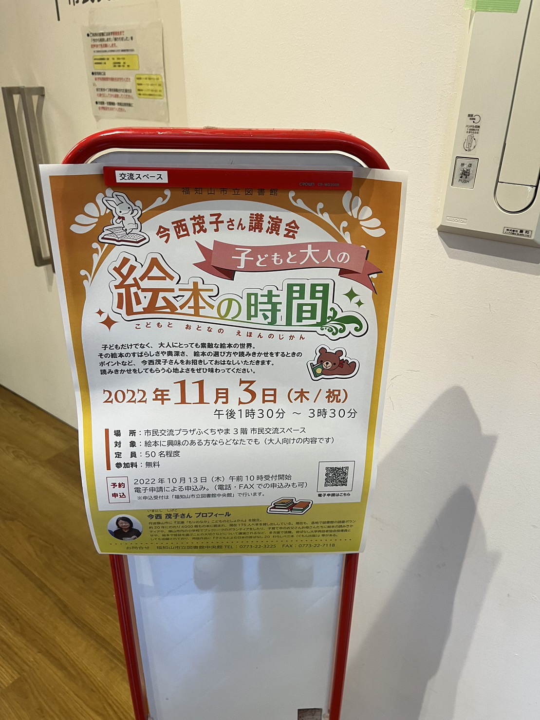 11月3日文化の日に、福知山市立図書館中央館で開催された「今西茂子さん講演会 子どもと大人の絵本の時間」に参加してきました。